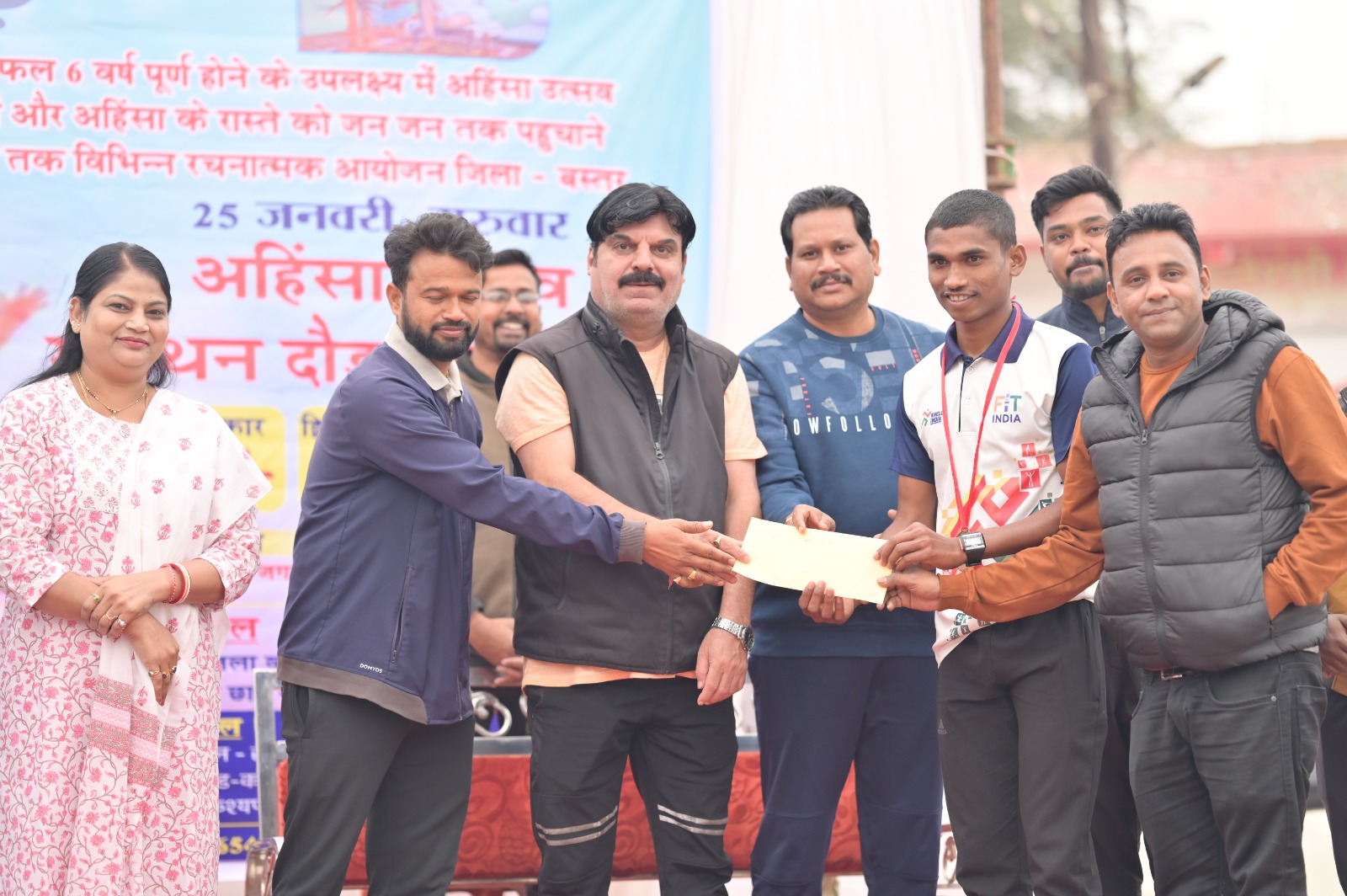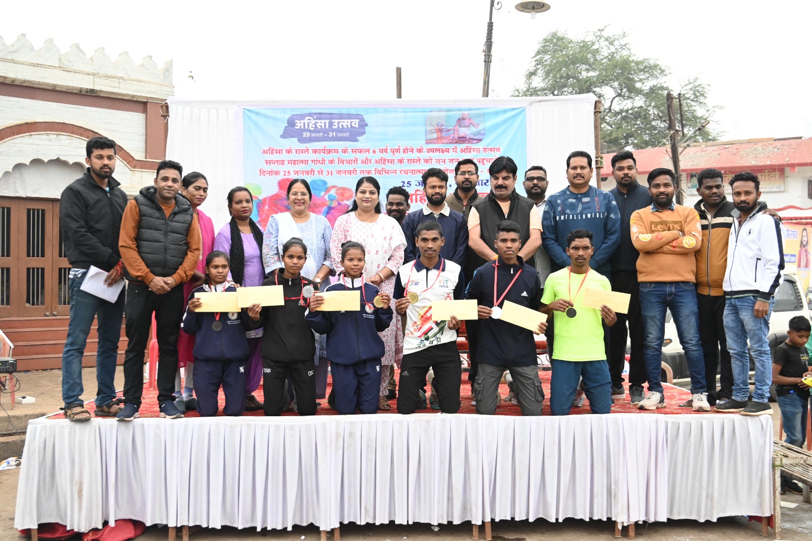 जिसके अंतर्गत आज बस्तर संभाग मुख्यालय जगदलपुर में अहिंसा उत्सव मैराथन दौड़ प्रतियोगिता का आयोजन किया गया जिसमें संभाग के विभिन्न जिलों से आए 119 बालक बालिकाओं ने प्रतिभागी के रूप में भाग लिया, मैराथन दौड़ प्रतियोगिता दंतेश्वरी मंदिर प्रांगण से आरंभ होकर संजय मार्केट होते हुए चांदनी चौक से एस बी आई चौक से गुजरती हुई मेन रोड से गोलबाजार से दंतेश्वरी मंदिर प्रांगण में समाप्त हुई,जिसमें बालक वर्ग में प्रथम हरलाल मंडावी,द्वितीय परदेशी राम,एवं तृतीय स्थान पर सोनू राम मरकाम कोन्डागांव जिले से आए धावकों ने कब्जा जमाया वहीं बालिका वर्ग में प्रथम प्रमिला मंडावी लोहन्डीगुड़ा, द्वितीय कुम्ली पोयाम जगदलपुर तथा तृतीय स्थान पर लोहन्डीगुड़ा की बालिका ममता कश्यप ने कब्जा जमाया जिन्हें प्रथम पुरस्कार के रूप में गोल्ड मैडल तथा 5100/- नगद पुरस्कार, द्वितीय पुरस्कार सिल्वर मैडल तथा 3100/- नगद पुरस्कार वहीं तृतीय पुरस्कार ब्रांज मैडल तथा 2100/- नगद पुरस्कार दिया गया।