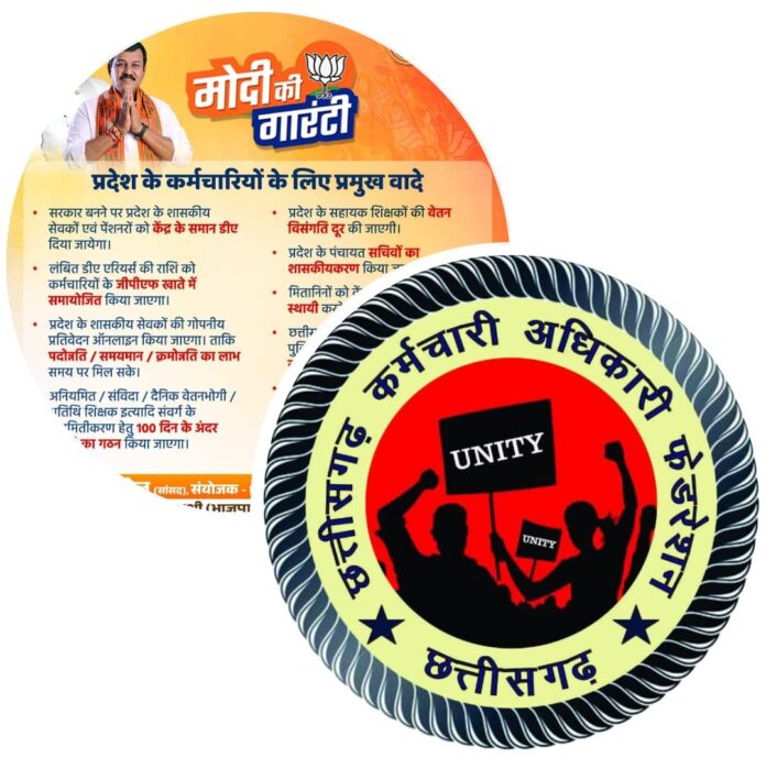 छत्तीसगढ़ कर्मचारी अधिकारी फेडरेशन के संभाग प्रभारी कैलाश चौहान, संभाग अध्यक्ष गजेंद्र श्रीवास्तव तथा जिला संयोजक आर डी तिवार * ने कहा कि विधानसभा चुनाव 2023 में भाजपा द्वारा अपने घोषणा पत्र में कर्मचारियों के लिए प्रमुख वादे *मोदी की गारंटी लाया गया था।