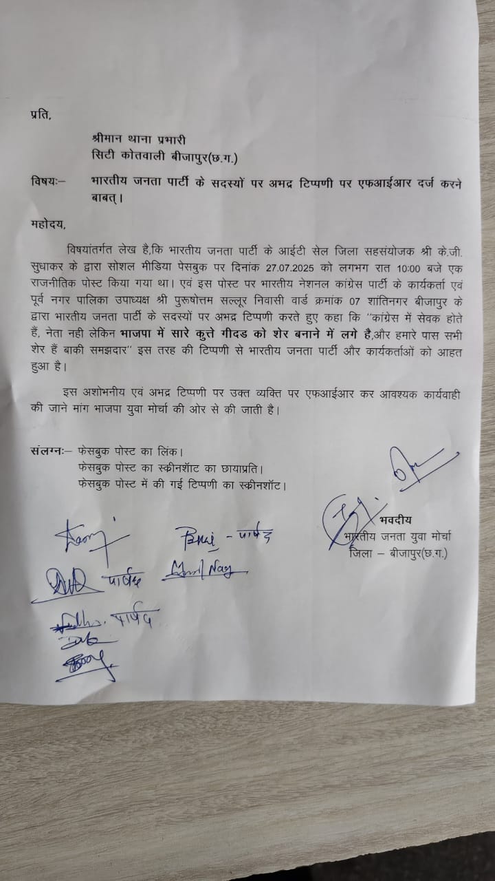 भाजपा कार्यकर्ताओं का कहना है कि यह टिप्पणी न केवल अशोभनीय है, बल्कि राजनीतिक मर्यादाओं का उल्लंघन भी करती है। उन्होंने तीन दिनों के भीतर ठोस कार्रवाई की मांग की है, साथ ही चेतावनी दी है कि यदि समयसीमा में कार्रवाई नहीं होती, तो भाजपा कार्यकर्ता बीजापुर कोतवाली का घेराव करेंगे।