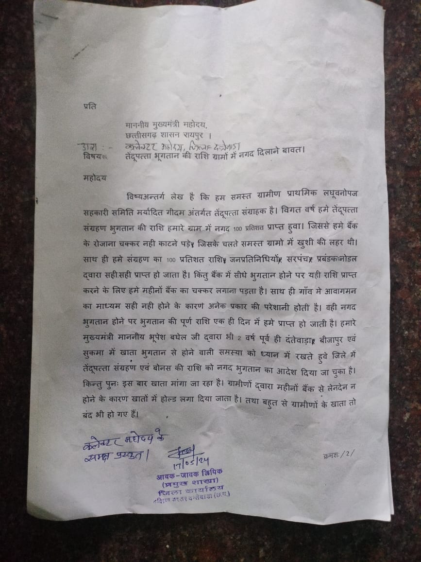 ग्रामीणों द्वारा तेंदूपत्ता संग्रहण के नगद भुगतान की मांग पर दंतेवाड़ा विधायक श्री चैतराम अटामी ने संग्राहको की समस्या को गंभीरता से लेते हुवे कहा कि आपकी मांगो को पूर्ण कराने का भरपूर प्रयाश किया जाएगा। श्री अटामी ने कहा कि मैं खुद तेंदूपत्ता संग्राहक परिवार से हूं। एवं खाता भुगतान से होने वाली समस्त समस्या से रूबरू हूं। मैं आपकी मांगो को मुख्यमंत्री से अवगत कराऊंगा।