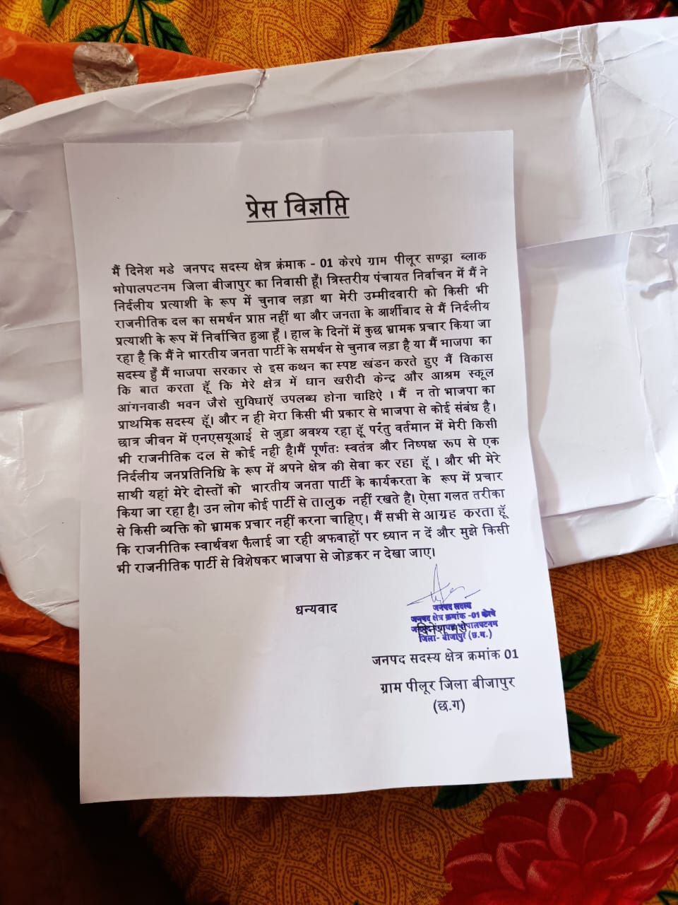 मुर्गेश शेट्टी,बीजापुर , 10 अगस्त। जनपद सदस्य क्षेत्र क्रमांक 01 केरपे (ग्राम पीलूर सण्ड्रा, ब्लॉक भोपालपटनम, जिला बीजापुर) से निर्वाचित जनप्रतिनिधि दिनेश मडे ने एक प्रेस विज्ञप्ति जारी कर खुद को पूर्णतः निर्दलीय बताते हुए किसी भी राजनीतिक दल, विशेषकर भारतीय जनता पार्टी से संबंध होने की अफवाहों को सिरे से खारिज किया है।