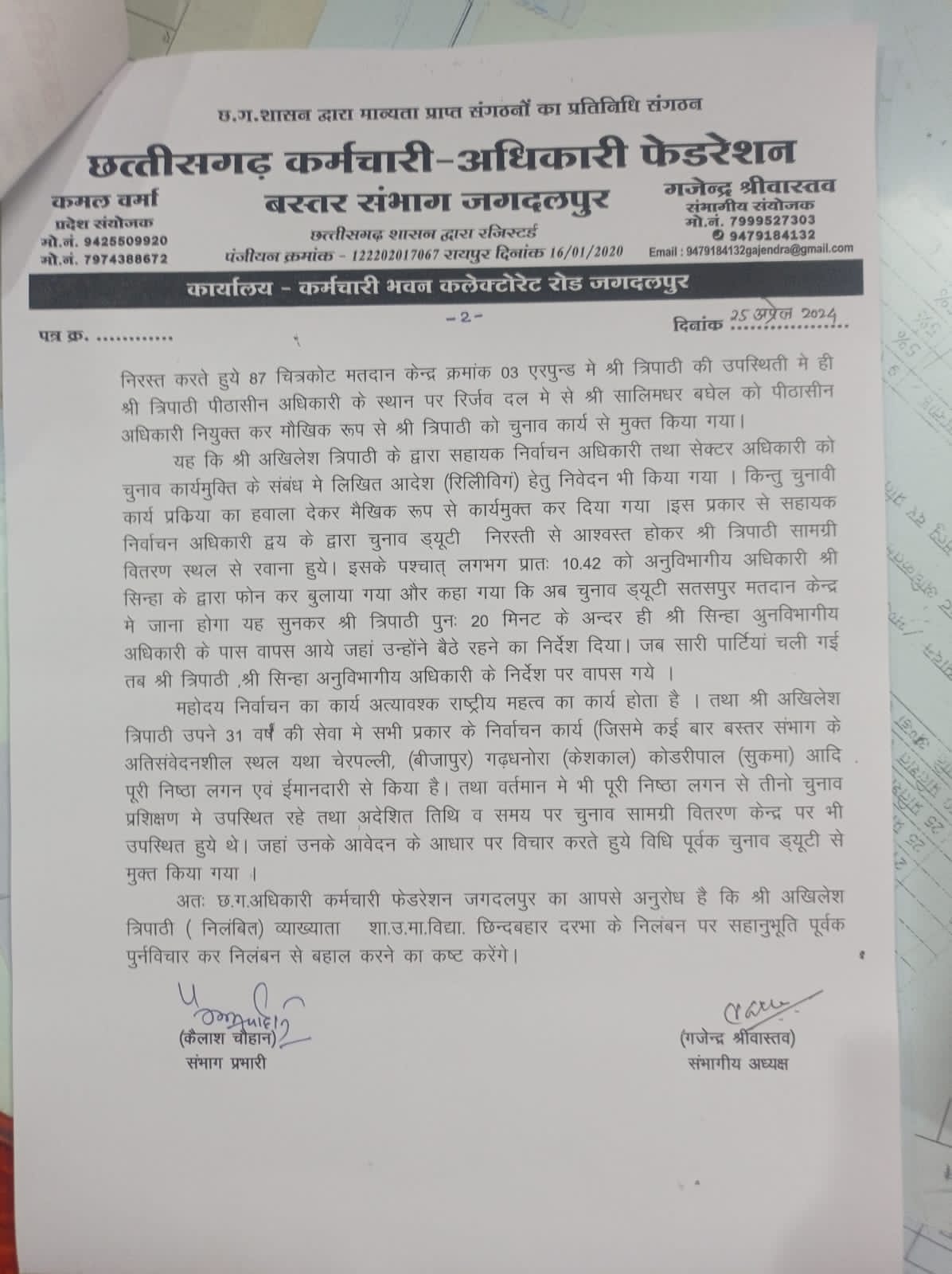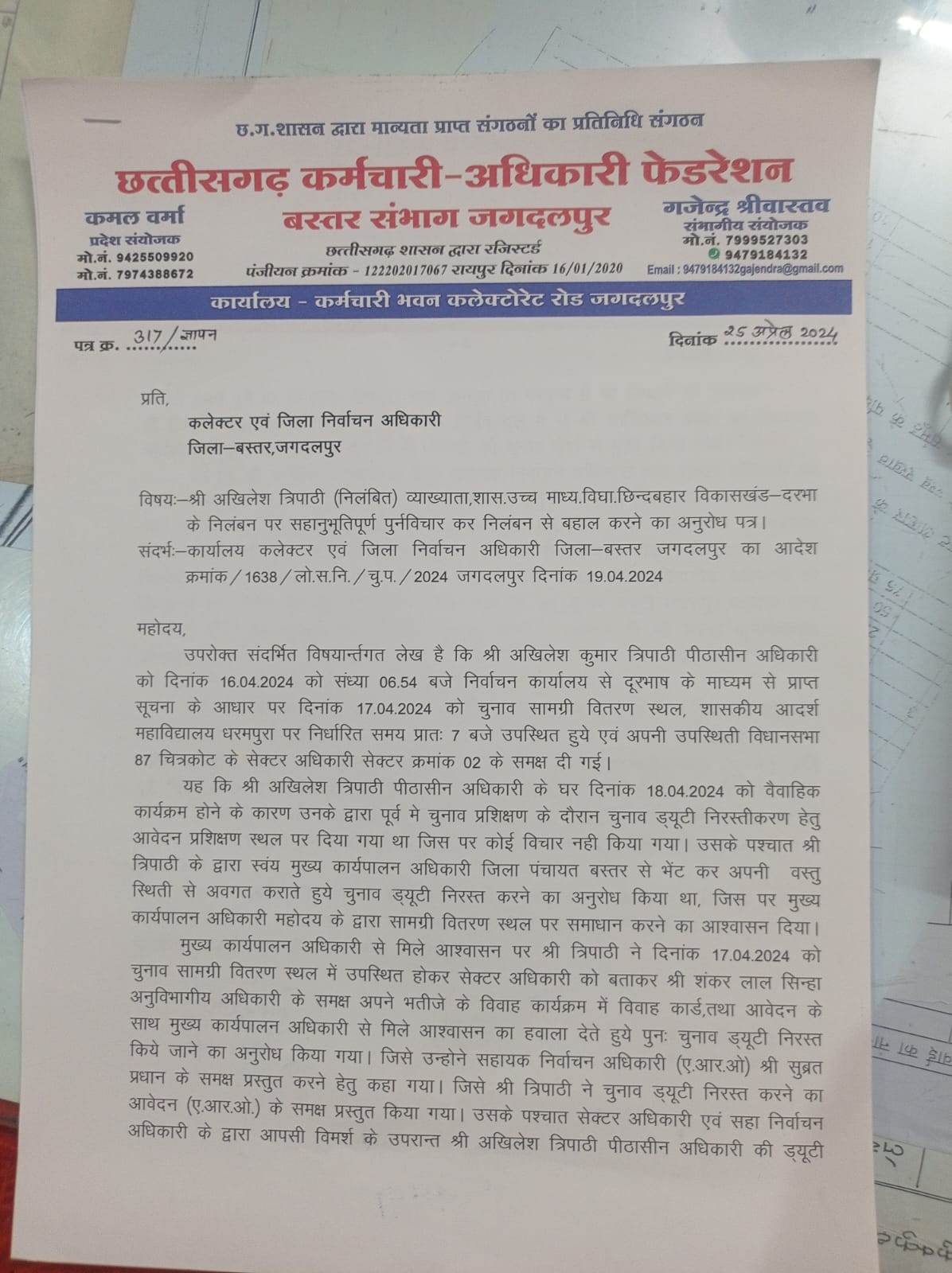 इसके संबंध में फेडरेशन ने कलेक्टर एवं जिला निर्वाचन अधिकारी बस्तर को एक ज्ञापन देकर संपूर्ण वस्तु स्थिति से अवगत कराया कि श्री त्रिपाठी मतदान सामग्री स्थल आदर्श महाविद्यालय धरमपुरा में उपस्थित रहे तथा उनकी उपस्थिति में ही उनकी ड्यूटी निरस्त किया जाकर किसी अन्य कर्मचारी की ड्यूटी लगाई गई थी। अत इन्हें अनुपस्थित मानकर निलंबन किया गया जो कि न्याय उचित नहीं है।