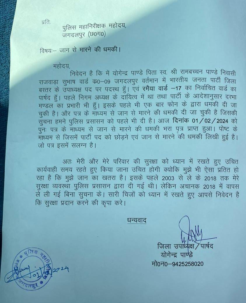 पत्र मिलने के बाद पार्षद योगेंद्र पांडे ने पुलिस महानिरीक्षक और पुलिस अधीक्षक को आवेदन देकर सुरक्षा की मांग की है ।