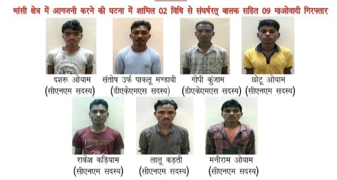 भांसी के डामर प्लांट में आगजनी घटना में शामिल 02 विधि से संघर्षरत् बालक सहित 09 माओवादी गिरफ्तार