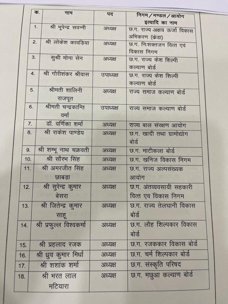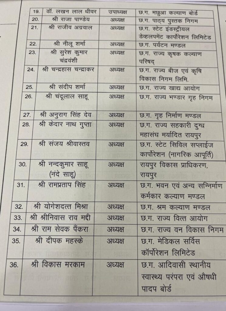 रायपुर। मुख्यमंत्री विष्णुदेव साय सरकार ने प्राधिकरणों के बाद बुधवार को निगम-मंडलों में भी नियुक्तियां कर दी है। प्रदेश के पिछड़ा वर्ग आयोग, युवा आयोग के अध्यक्ष के बाद अब अन्य आयोग मंडलों में सदस्यों की भी नियुक्ति की गई है।जगदलपुर के वरिष्ठ भाजपा नेता श्रीनिवास मद्धि को वित्त आयोग का अध्यक्ष नियुक्त किया गया है ।देखें पूरी सूची..