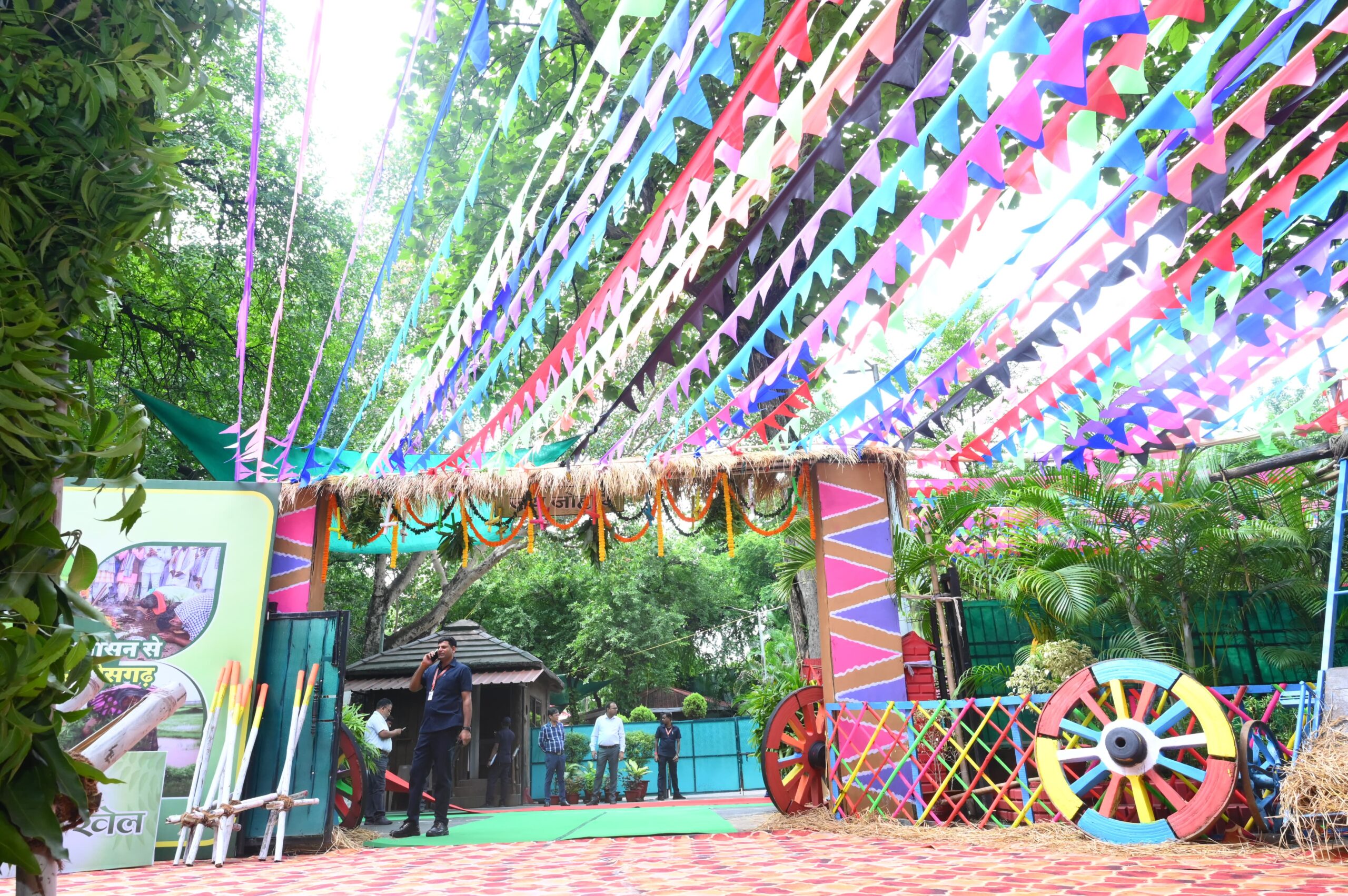 मुख्य कार्यक्रम मंडप के बाएँ हिस्से में छत्तीसगढ़ के ग्रामीण परिवेश का पारम्परिक घर बना है। इस घर के आहते को मैदानी छत्तीसगढ़ की चित्रकला से सजाया गया है। घर के आँगन में तुलसी चौरा और गौशाला है, जहाँ हल, कुदाल, रापा, गैती, टंगिया, सब्बल जैसे पारम्परिक कृषि यंत्र के साथ ही गोबर के उपले रखे हैं। इस ग्रामीण घर की दीवारों को सरगुजा की रजवार पेंटिंग के सुंदर चित्रों से सजाया गया है।