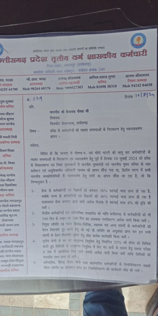 जगदलपुर । छत्तीसगढ़ प्रदेश तृतीय वर्ग शासकीय कर्मचारी संघ द्वारा प्रदेश के कर्मचारियों को 4 प्रतिशत महंगाई भत्ता सहित 10 सूत्रीय मांगों के लिए 10 जुलाई 2024 से चरणबद्ध आंदोलन प्रारंभ किया गया था।
